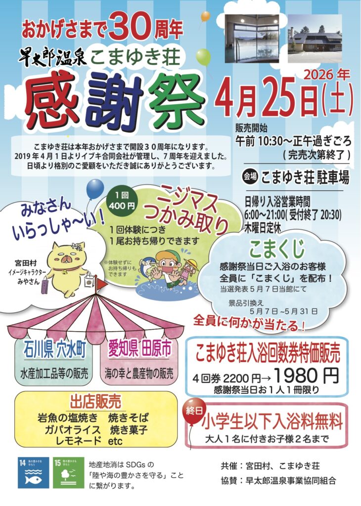 4/25(土)こまゆき荘感謝祭♨️ 投稿日: 2026年4月14日 4月25日土曜日にこまゆき荘にて感謝祭を行います。 毎年大人気のマス掴み取りを始め、「石川県穴水町」「愛知県田原市」からの出店や村内店舗さんの出店販売があります。 是非、皆様足をお運びいただき、感謝祭を楽しんでいただければと思います。 #感謝祭 #宮田村 #温泉 #駒ヶ根高原 #長野県 #穴水町 #田原市 #コンサート #こまゆき荘 #日帰り温泉 #早太郎温泉 #開湯30周年